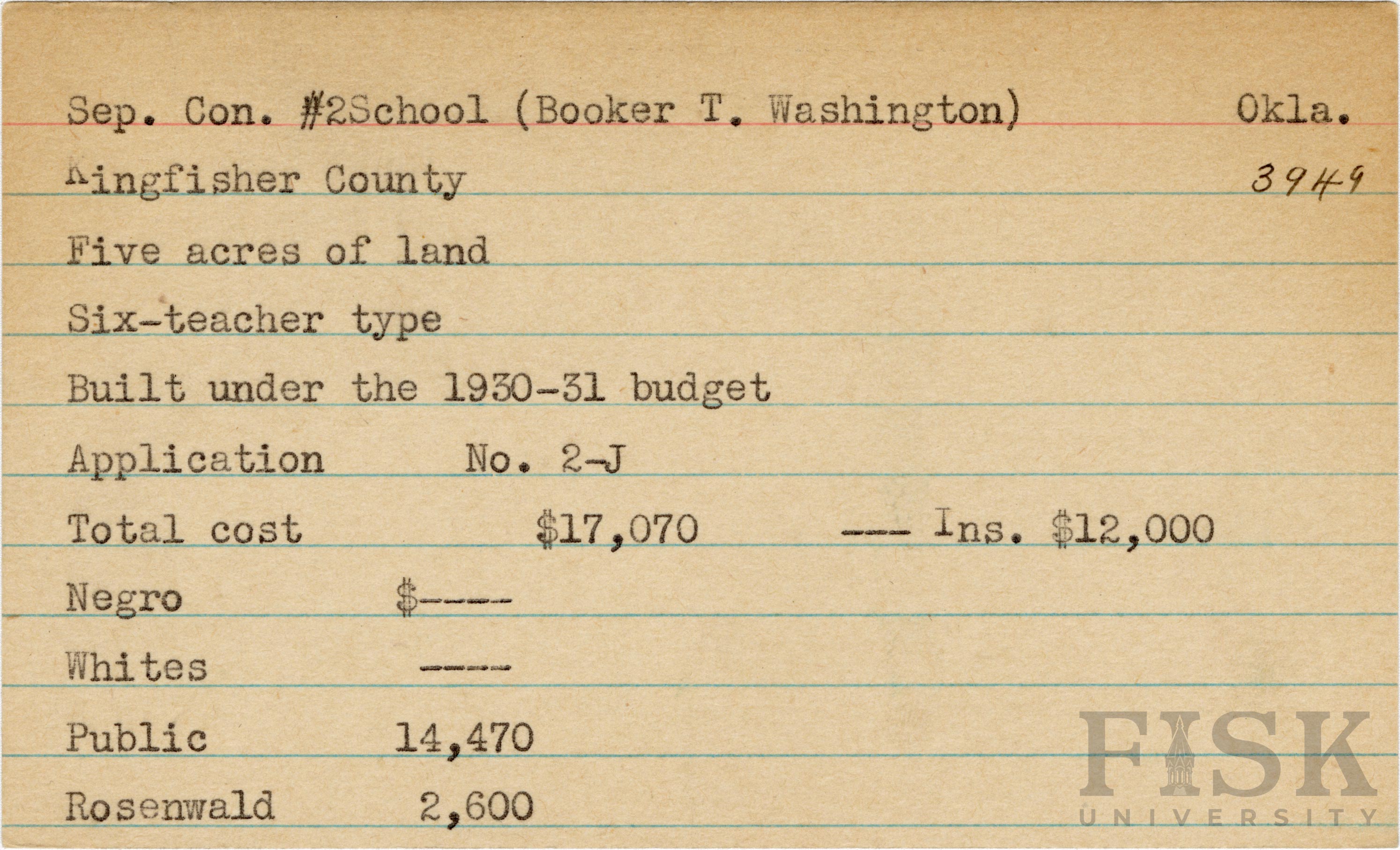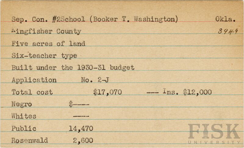 - School card from Rosenwald Fund for Sep. Con. No. 2 School in Kingfisher County, Oklahoma with a section added to the budget contributions that says, "Ins. $12,000"
