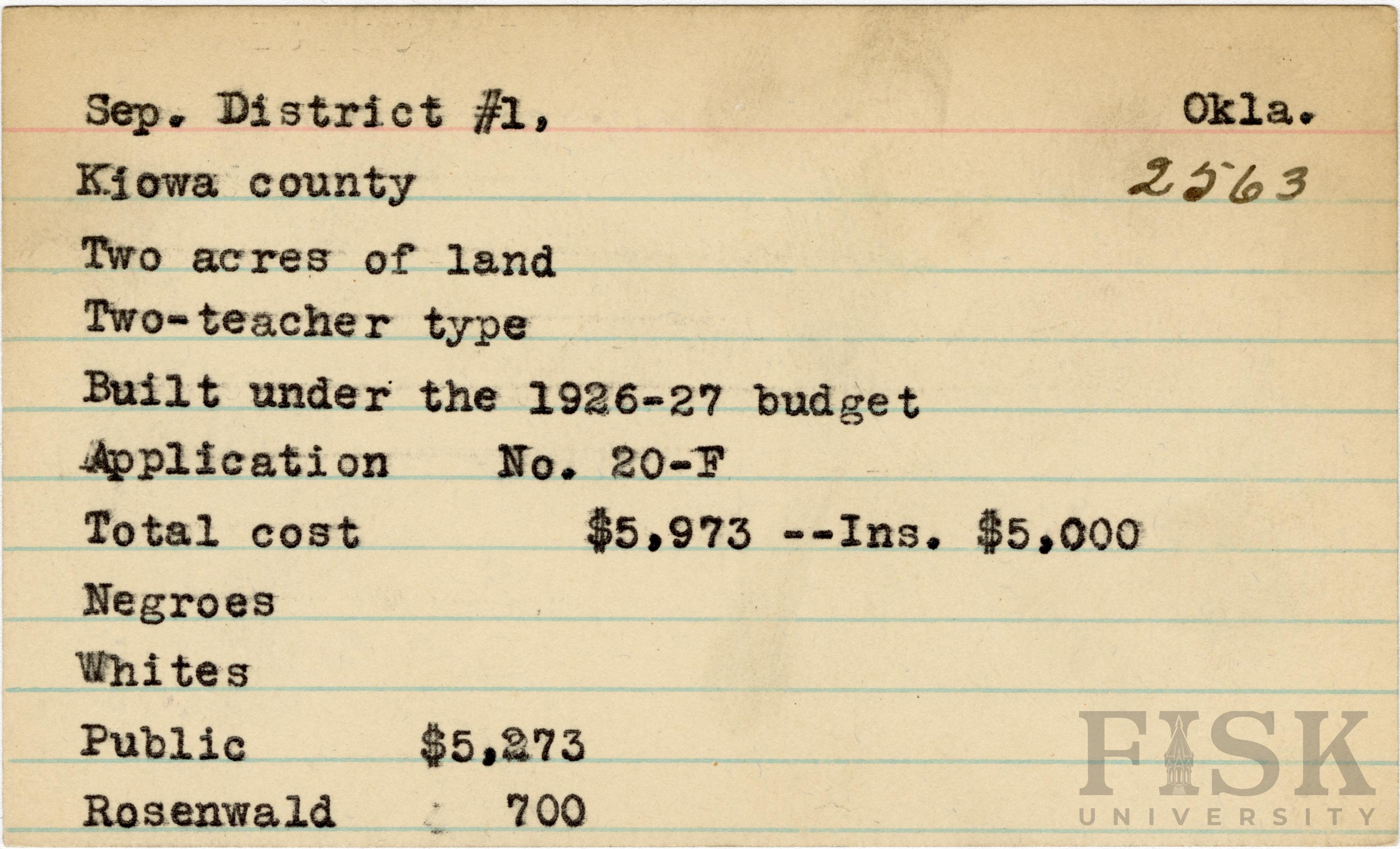 School card from Rosenwald Fund for Sep. District No. 1 in Kiowa County, Oklahoma with a section added to the budget contributions that says, "Ins. $5,000"