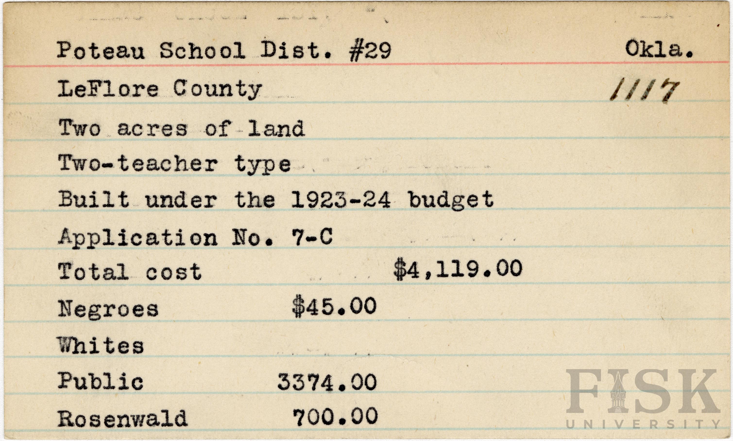 - School card from Rosenwald Fund for Poteau School Dist. No. 29 in LeFlore County, Oklahoma
