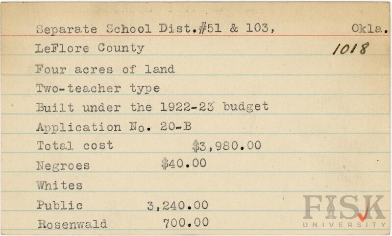 - School card from Rosenwald Fund for Separate School Dist. No. 51 & 103 in LeFlore County, Oklahoma