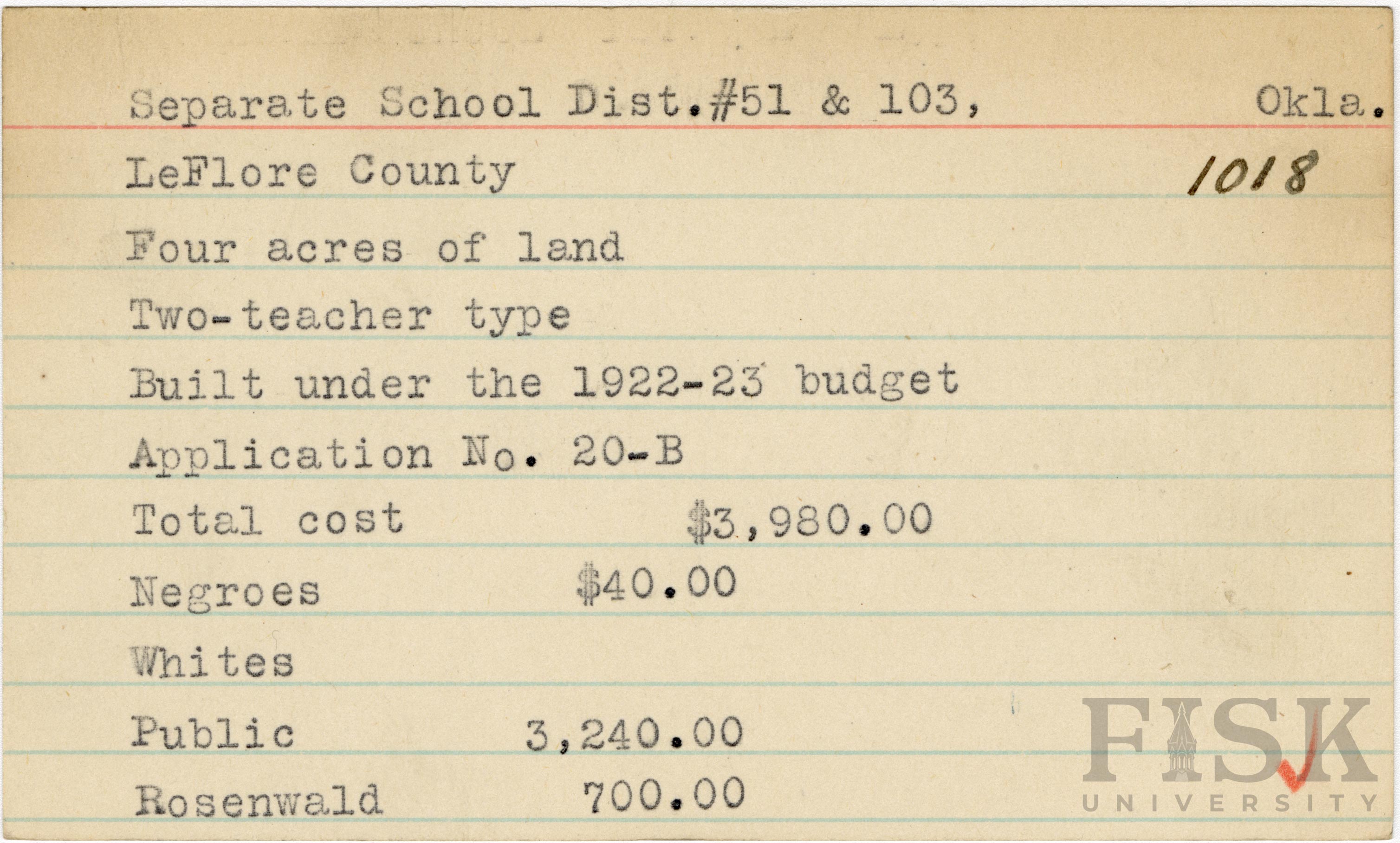 School card from Rosenwald Fund for Separate School Dist. No. 51 & 103 in LeFlore County, Oklahoma