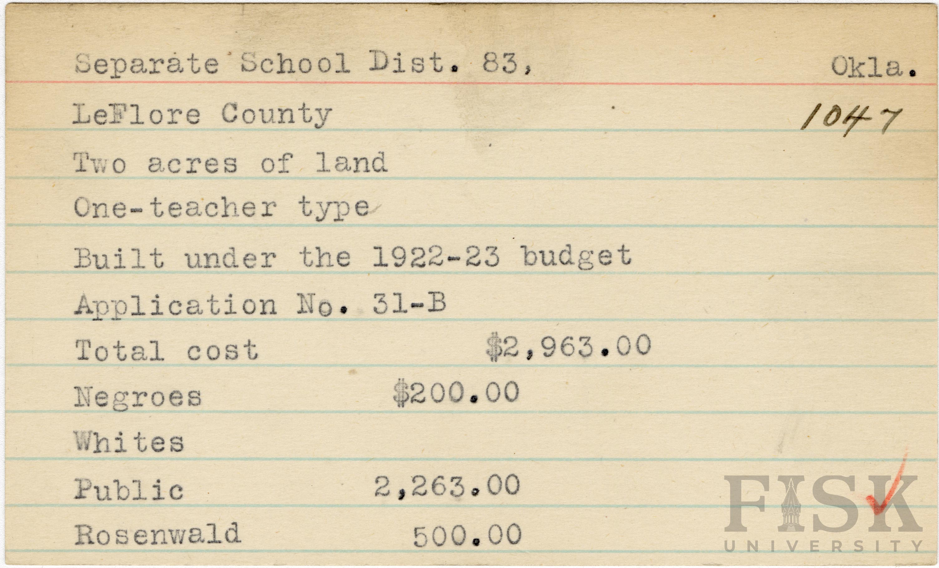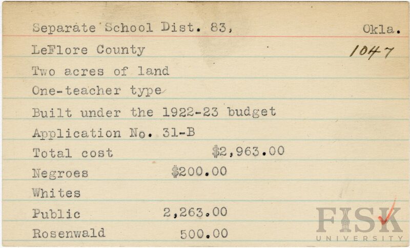- School card from Rosenwald Fund for Separate School Dist. No. 83 in LeFlore County, Oklahoma