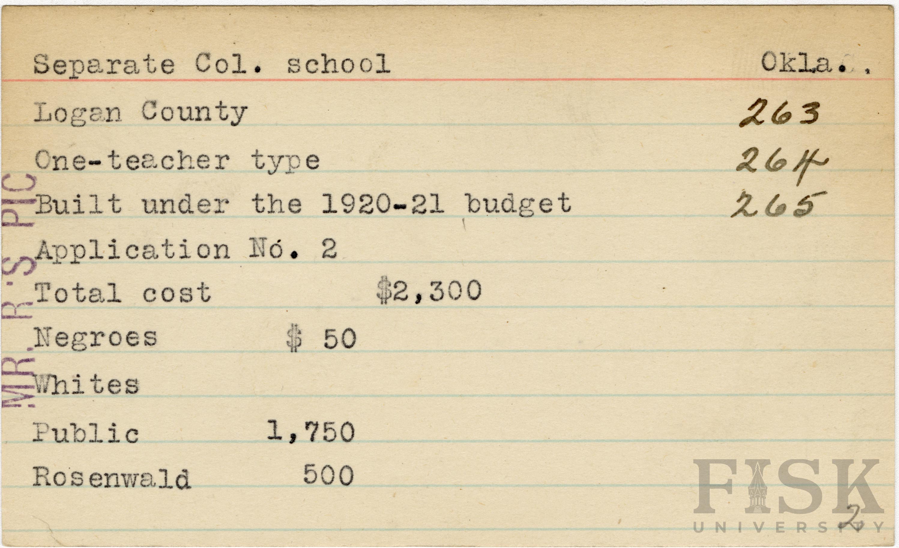 - School card from Rosenwald Fund for Separate Col. School in Logan County, Oklahoma with a note on the far left of the card that says, "Mr. R's Pic"