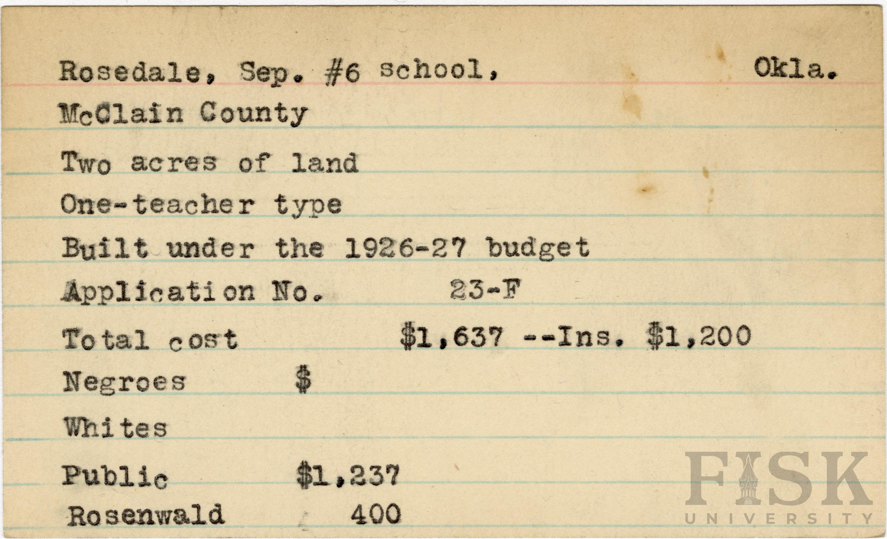 - School card from Rosenwald Fund for Rosedale Sep. No. 6 School in McClain County, Oklahoma with a section added to the budget contributions that says, "Ins. $1,200"