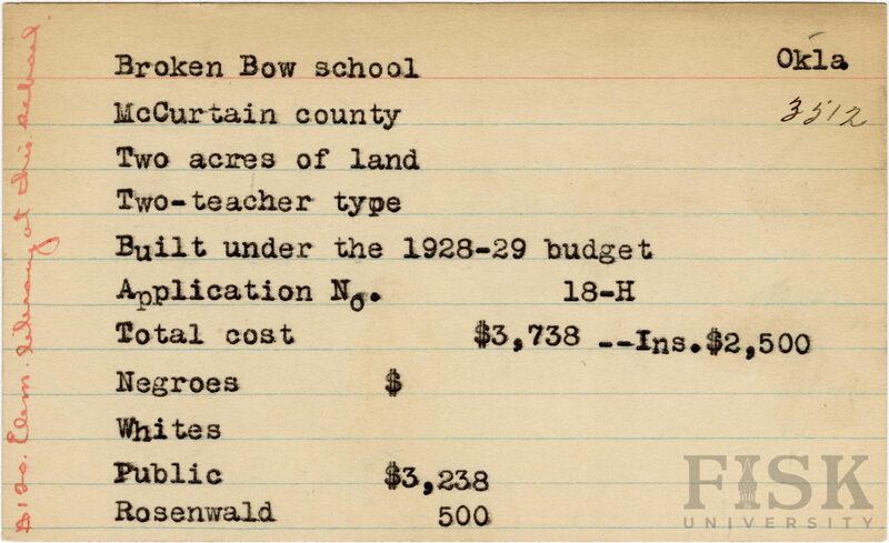 - School card from Rosenwald Fund for Broken Bow School in McCurtain County, Oklahoma with a section added to the budget contributions that says, "Ins. $2,500" and a handwritten note on the far left of the card that says, "$120 elem library at this school"