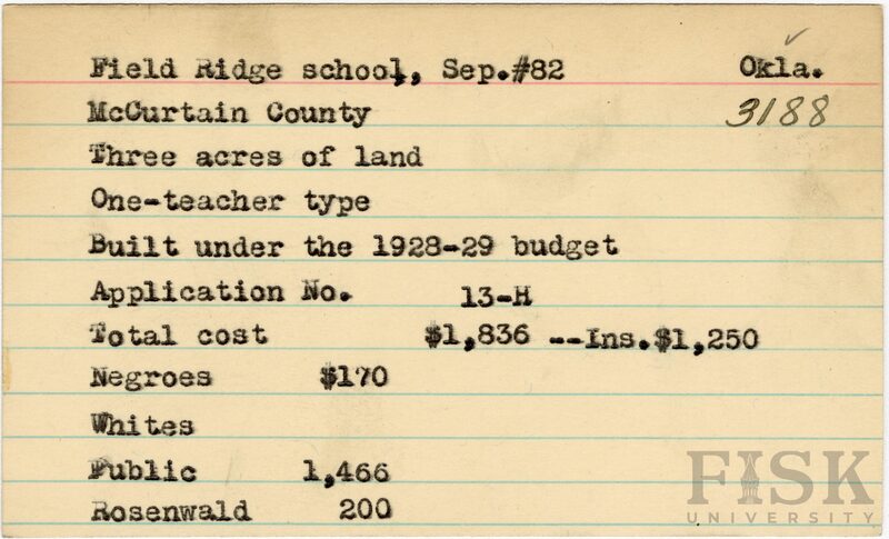 - School card from Rosenwald Fund for Field Ridge School in McCurtain County, Oklahoma with a section added to the budget contributions that says, "Ins. $1,250"