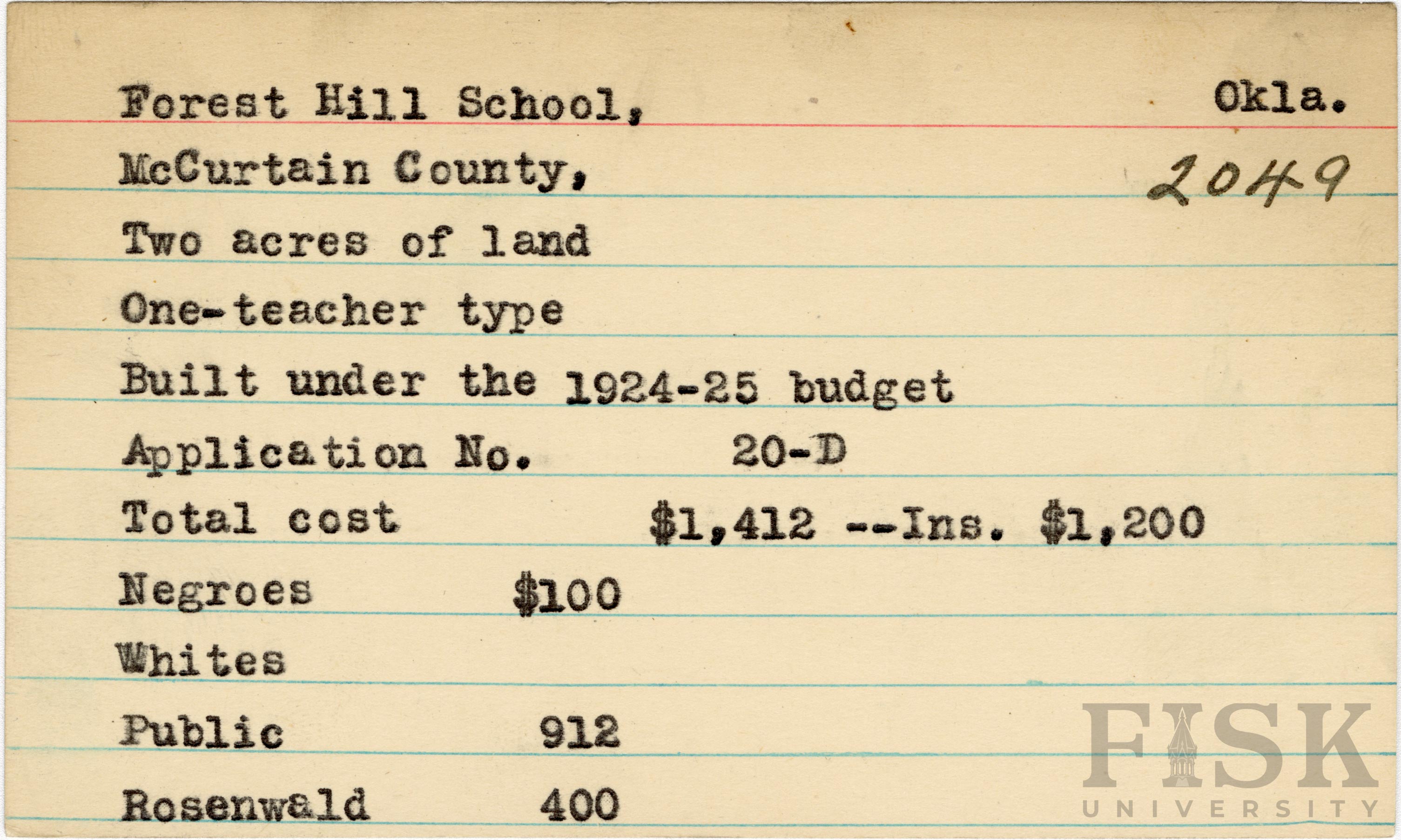 - School card from Rosenwald Fund for Forest Hill School in McCurtain County, Oklahoma in a section added to the budget contributions that says, "Ins. $1,200"