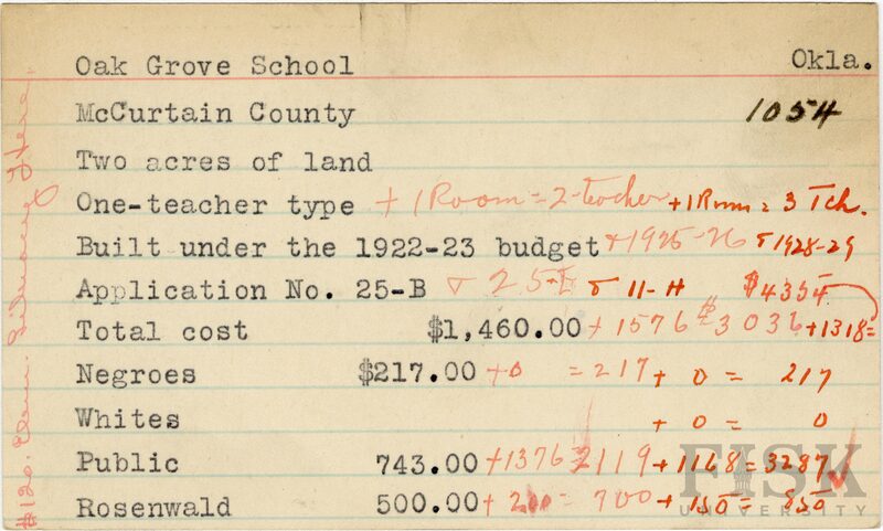 - School card from Rosenwald Fund for Oak Grove School in McCurtain County, Oklahoma with handwritten addition to the teacher type, budget year, application number, and budget contribution sections and a handwritten note on the far left of the card that says, "$120 elem library here"