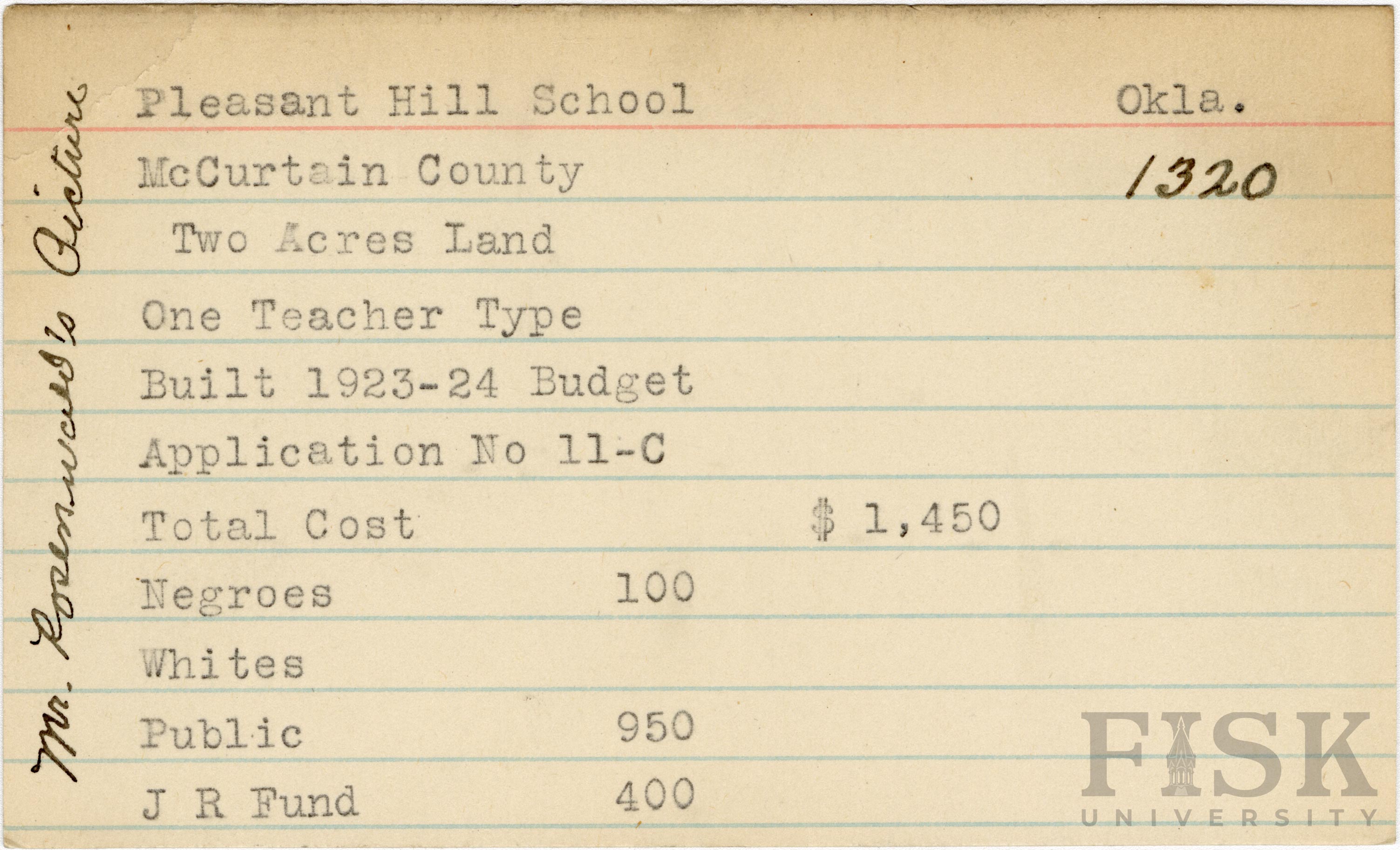 - School card from Rosenwald Fund for Pleasant Hill School in McCurtain County, Oklahoma with a handwritten note on the far left of the card that says, "Mr. Rosenwald's Picture"