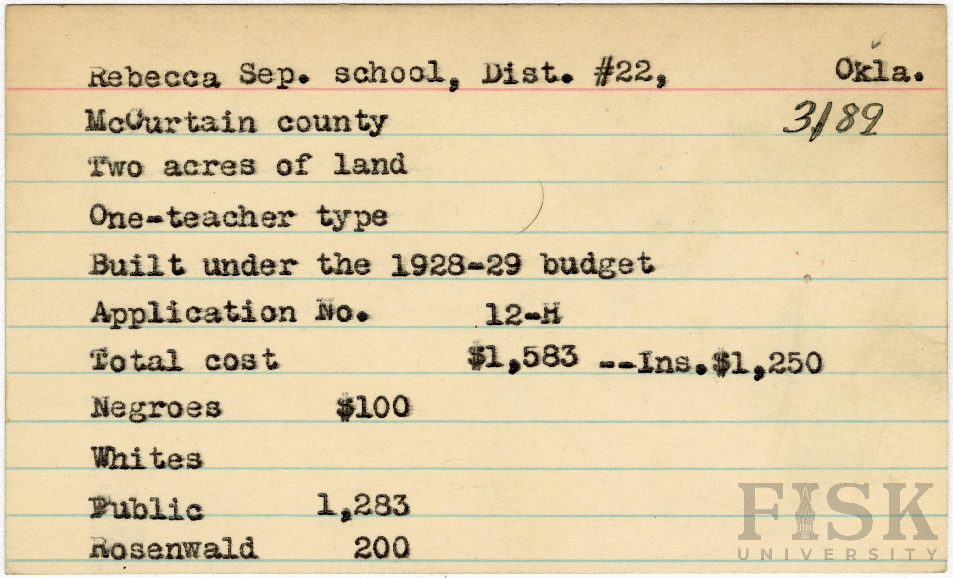 - School card from Rosenwald Fund for Rebecca Sep. School in McCurtain County, Oklahoma with a section added to the budget contributions that says, "Ins. $1,250"