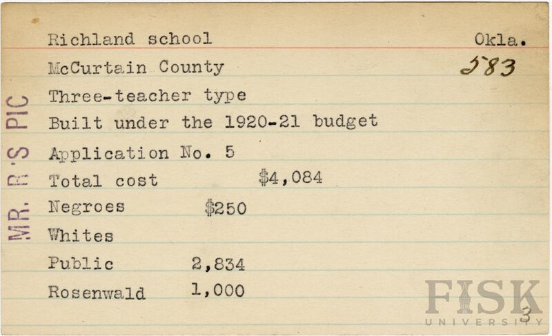 - School card from Rosenwald Fund for Richland School in McCurtain County, Oklahoma with a note on the far left of the card that says, "Mr. R's Pic"