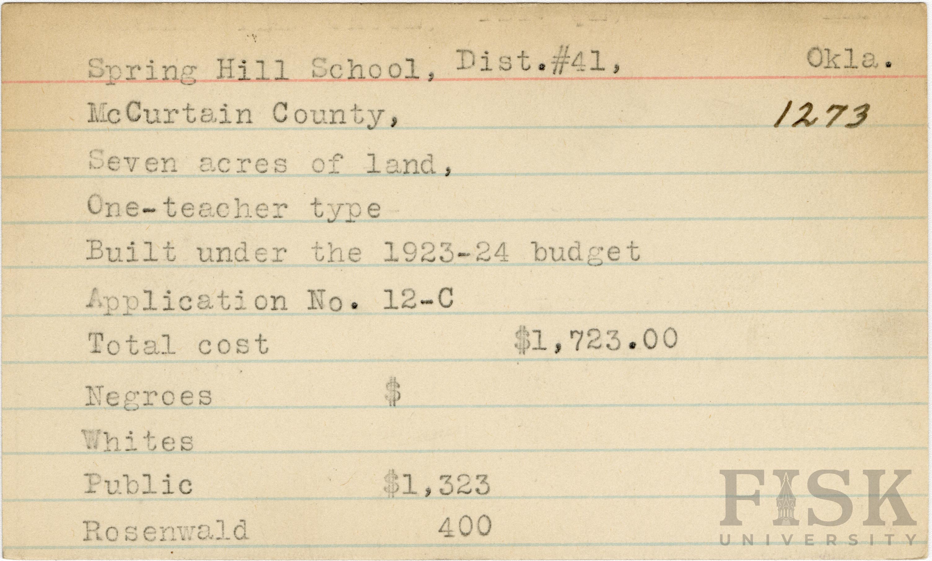 - School card from Rosenwald Fund for Spring Hill School in McCurtain County, Oklahoma