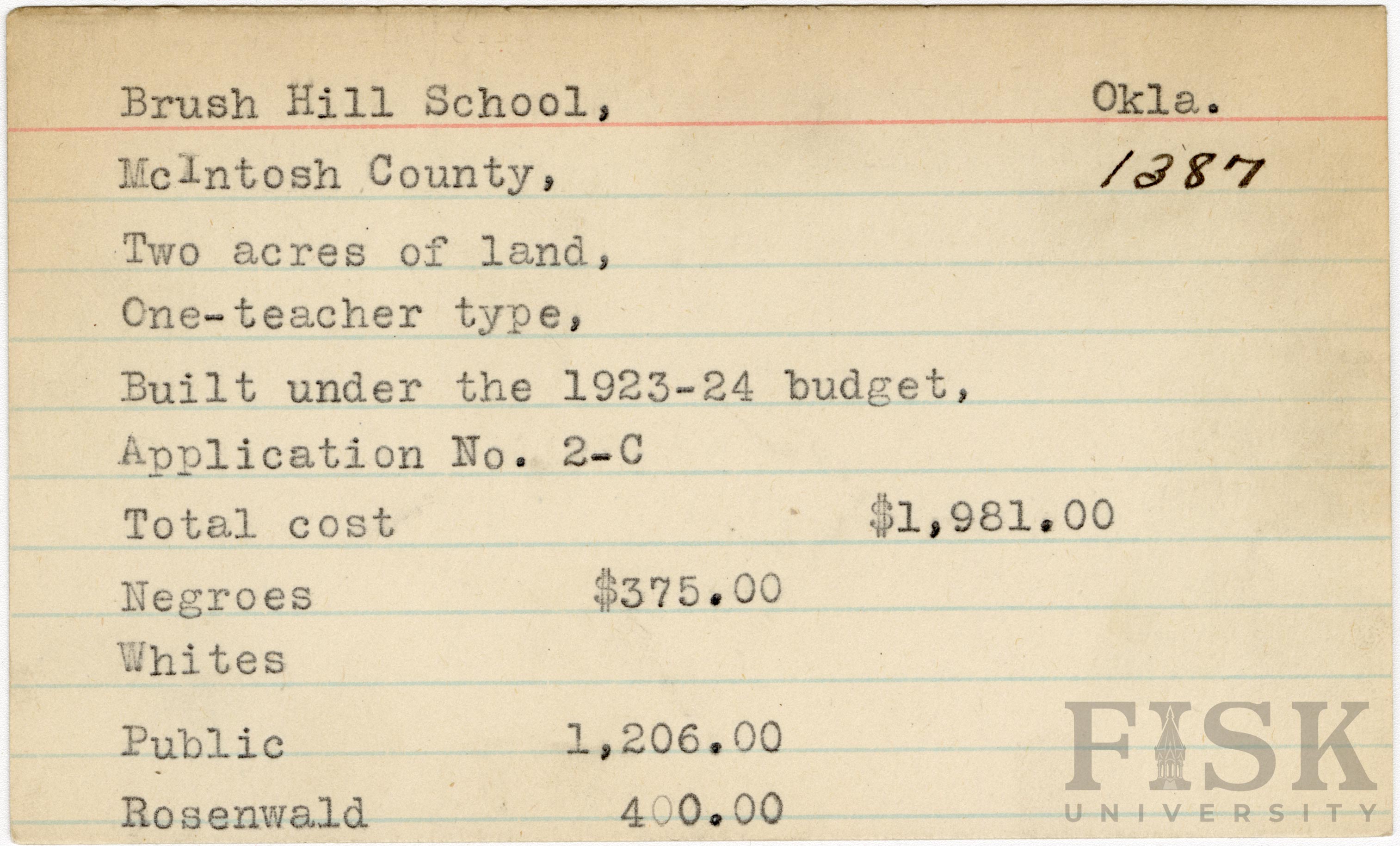 - School card from Rosenwald Fund for Brush Hill School in McIntosh County, Oklahoma