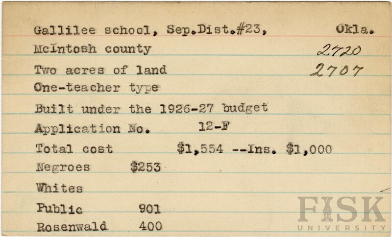 - School card from Rosenwald Fund for Gallilee School in McIntosh County, Oklahoma with a section added to the budget contributions that says, "Ins. $1,000"