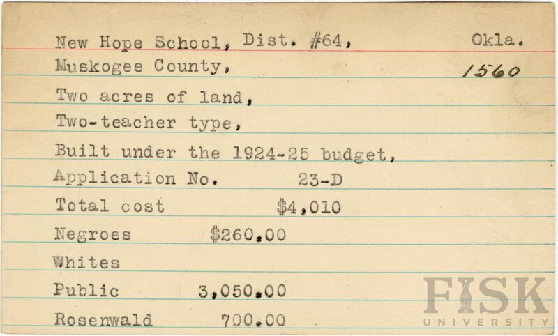 - School card from Rosenwald Fund for New Hope School in Muskogee County, Oklahoma
