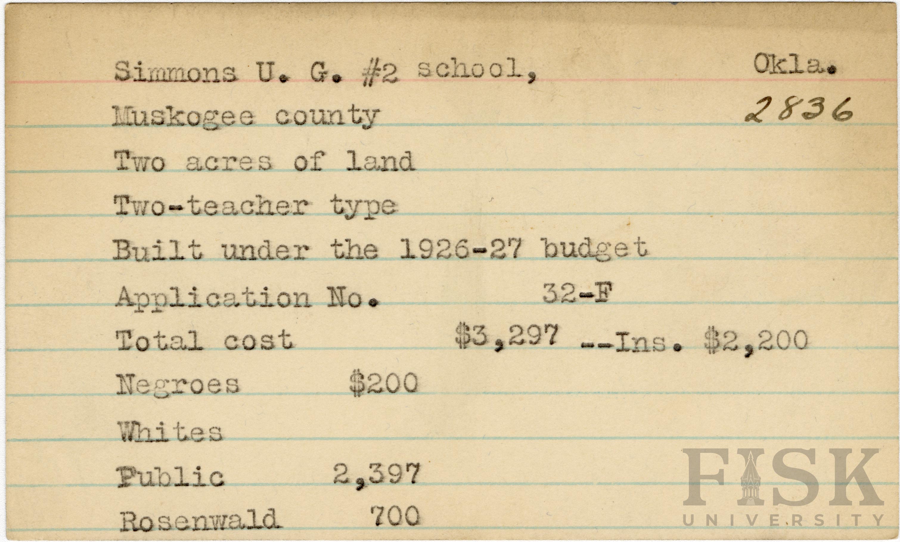 School card from Rosenwald Fund for Simmons U. G. No. 2 School in Muskogee County, Oklahoma with a section added to the budget contributions that says, "Ins. $2,200"