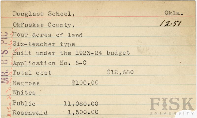 - School card from Rosenwald Fund for Douglass School in Okfuskee County, Oklahoma with notes on the far left of the card that say, "Mr. R's Pic" and "$120 H.S. library here"