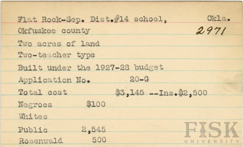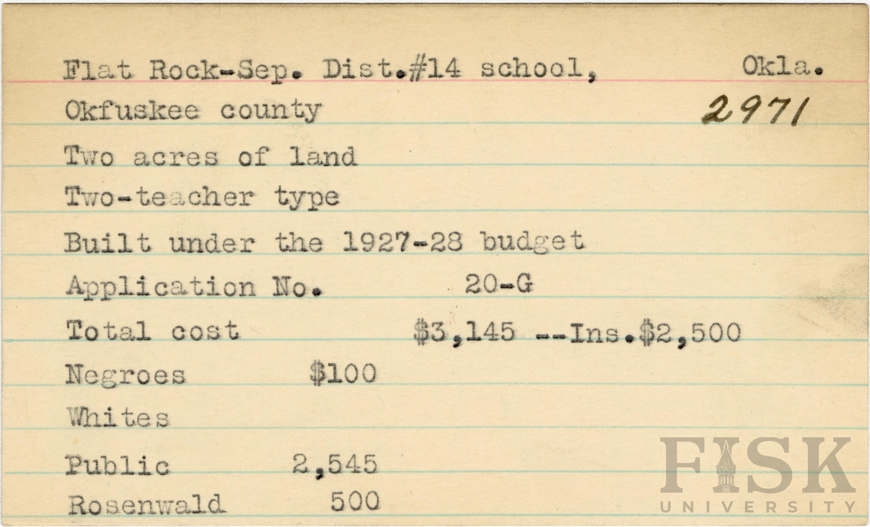 - School card from Rosenwald Fund for Flat Rock School in Okfuskee County, Oklahoma with a section added to the budget contributions that says, "Ins. $2,500"
