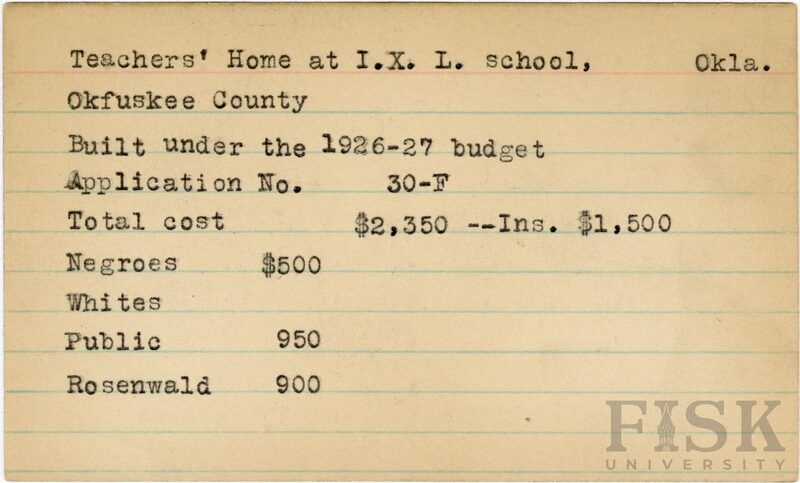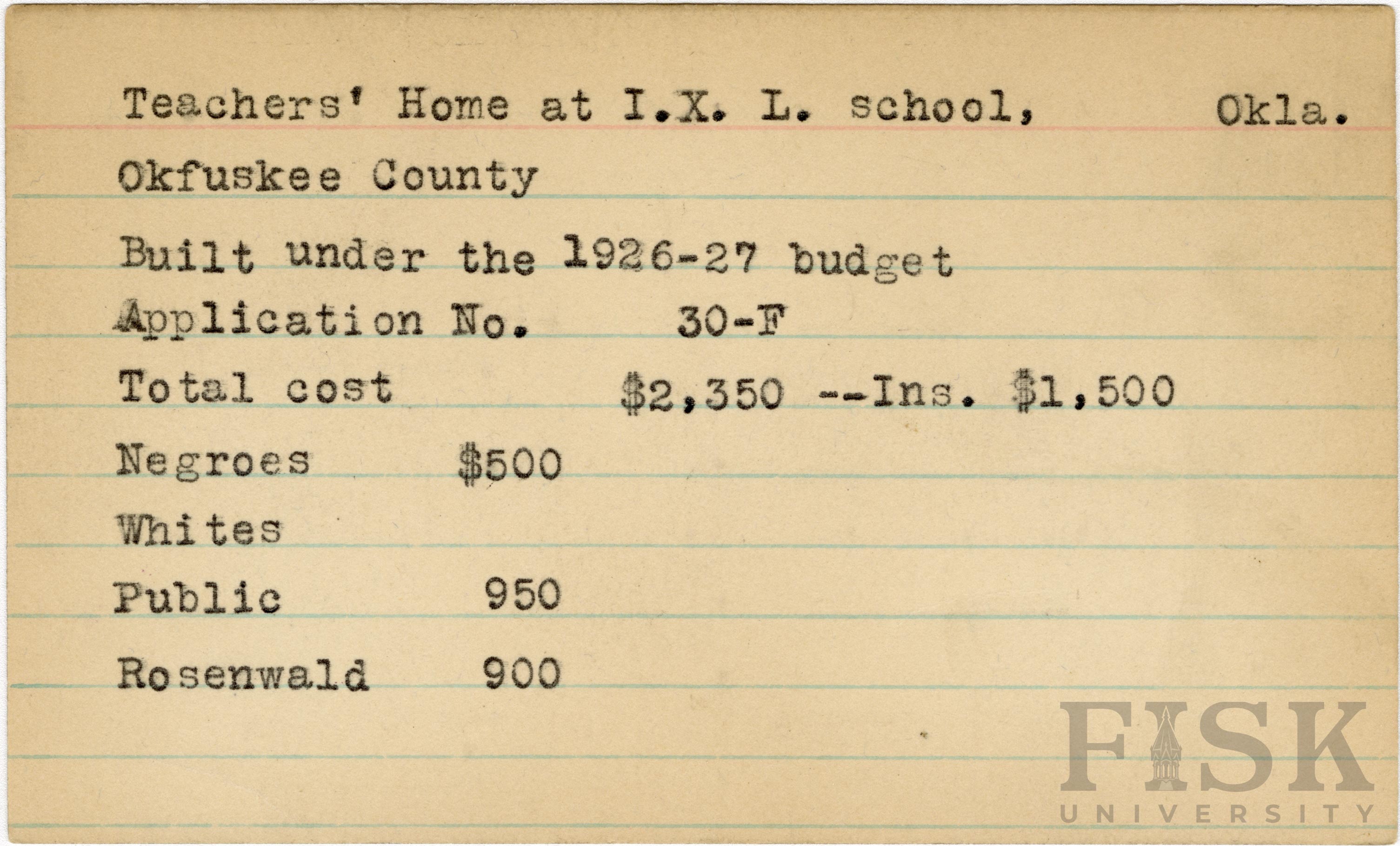 - School card from Rosenwald Fund for the teacher's home at I. X. L. District No. 12 School in Okfuskee County, Oklahoma with a section added to the budget contributions that says, "Ins. $1,500"