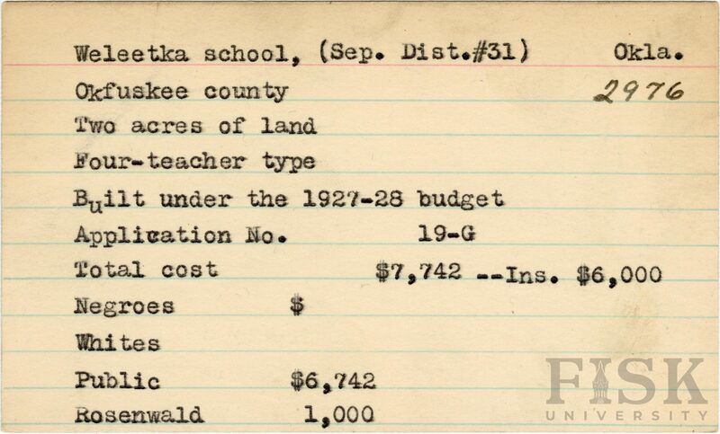 - Julius Rosenwald Fund--Buildings, African American schools--History--20th century, African American schools--Weleetka School