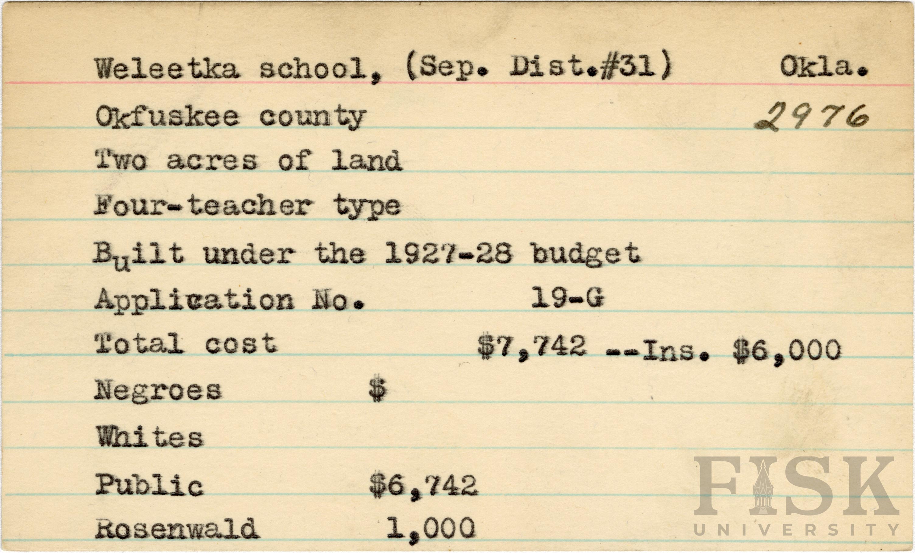 - School card from Rosenwald Fund for Weleetka School in Okfuskee County, Oklahoma with a section added to the budget contributions that says, "Ins. $6,000"