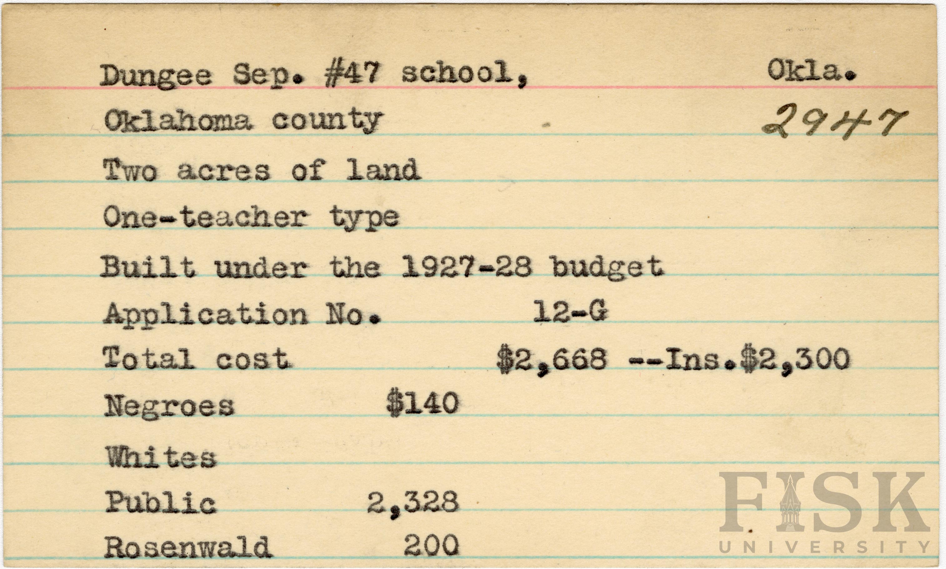 - School card from Rosenwald Fund for Dungee Sep. No. 47 School in Oklahoma County, Oklahoma with a section added to the budget contributions that says, "Ins. $2,300"