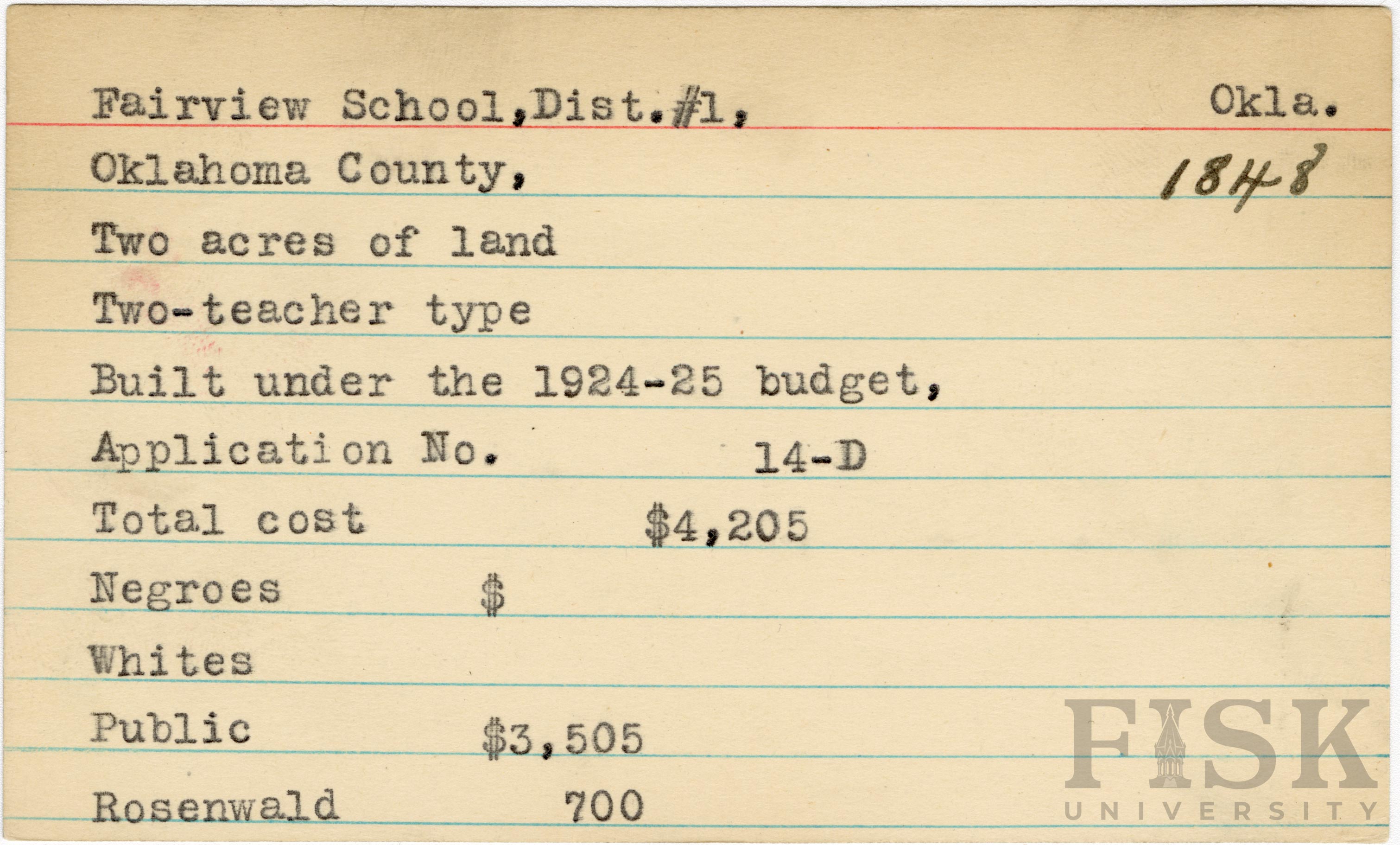 - School card from Rosenwald Fund for Fairview School in Oklahoma County, Oklahoma