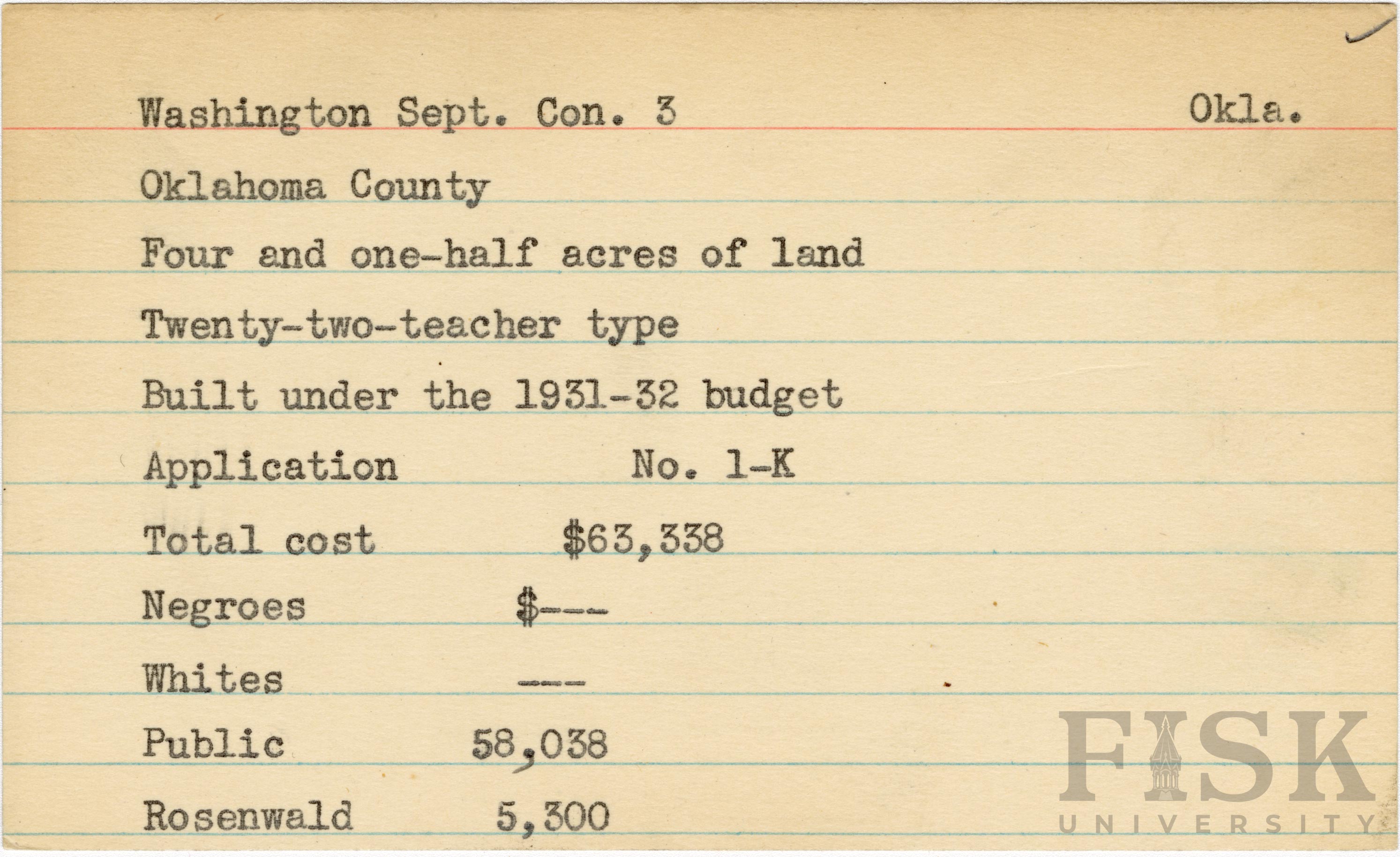 - School card from Rosenwald Fund for Washington Sept. Con. 3 in Oklahoma County, Oklahoma