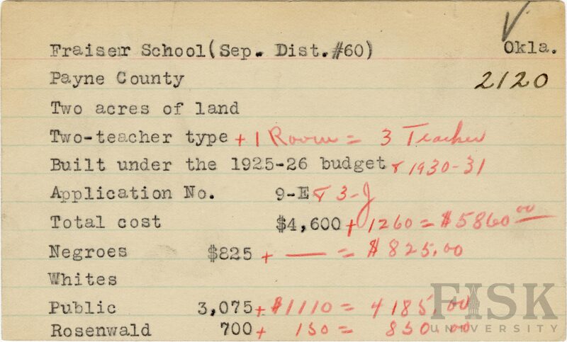 School card from Rosenwald Fund for Fraiser School in Payne County, Oklahoma with handwritten additions to the teacher type, budget year, application number, and budget contribution sections