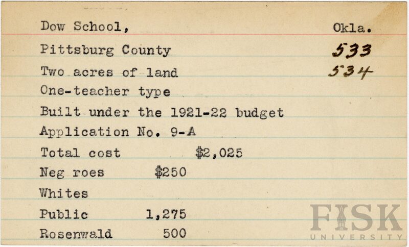 - School card from Rosenwald Fund for Dow School in Pittsburg County, Oklahoma
