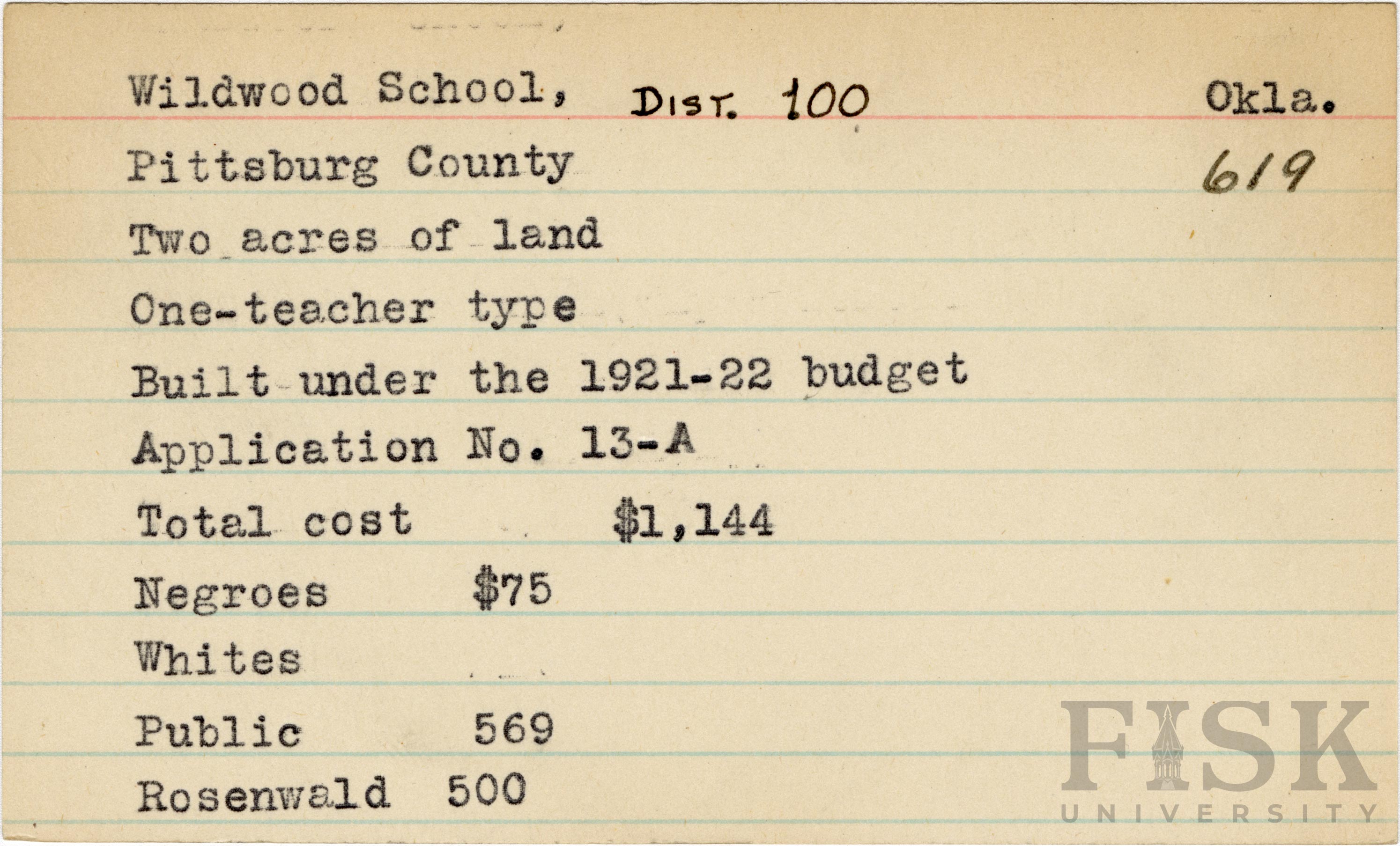 - School card from Rosenwald Fund for Wildwood School in Pittsburg County, Oklahoma