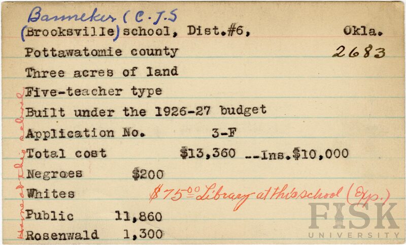 School card from Rosenwald Fund for Brooksville School in Pottawatomie County, Oklahoma with a section added to the budget contributions that says, "Ins. $10,000" and handwritten notes on the card that say, "Home at this school" and "$75.00 library at this school (Exp)"