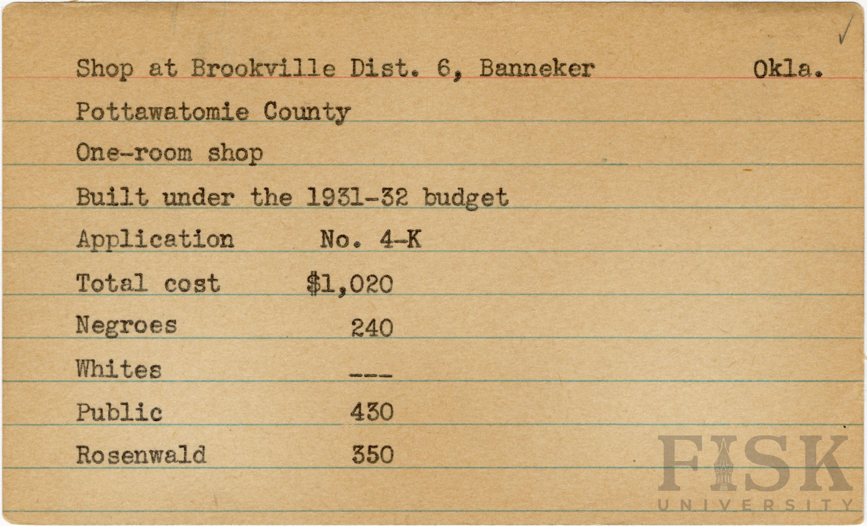 - School card from Rosenwald Fund for the one room shop at Brooksville School in Pottawatomie County, Oklahoma