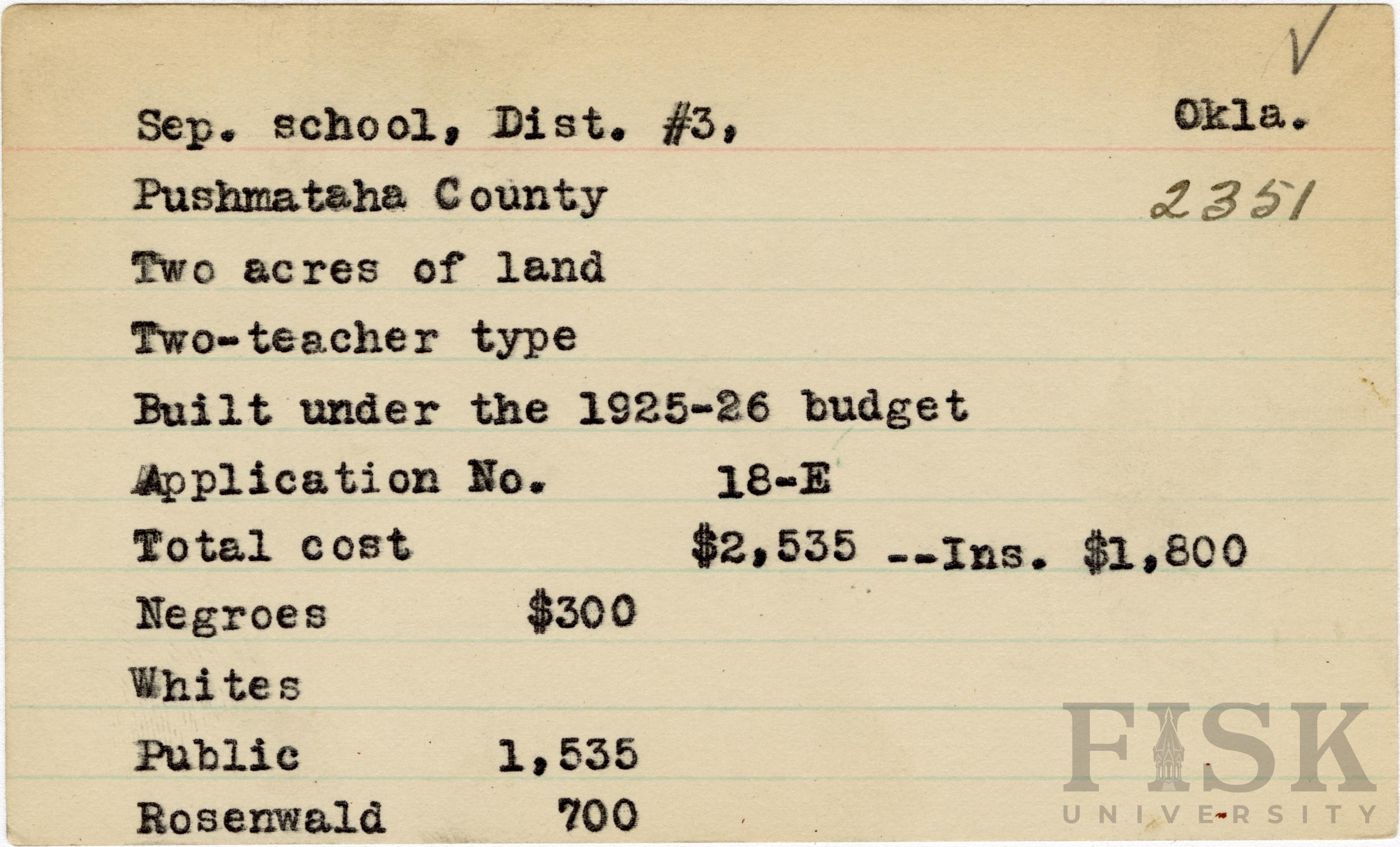 - School card from Rosenwald Fund for Sep. School Dist. No. 3 in Pushmataha County, Oklahoma with a section added to the budget contributions that says, "Ins. $1,800"