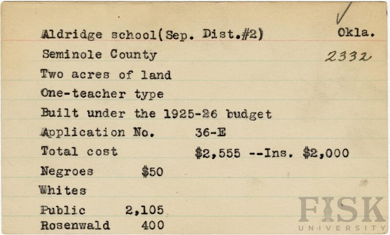 School card from Rosenwald Fund for Aldridge School in Seminole County, Oklahoma with a section added to the budget contributions that says, "Ins. $2,000"