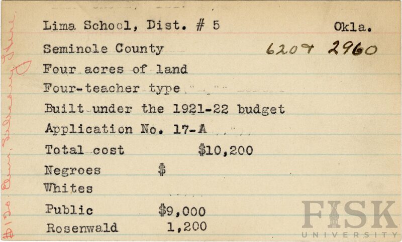 - School card from Rosenwald Fund for Lima School in Seminole County, Oklahoma with a handwritten note on the far left of the card that says, "$120 elem library here"