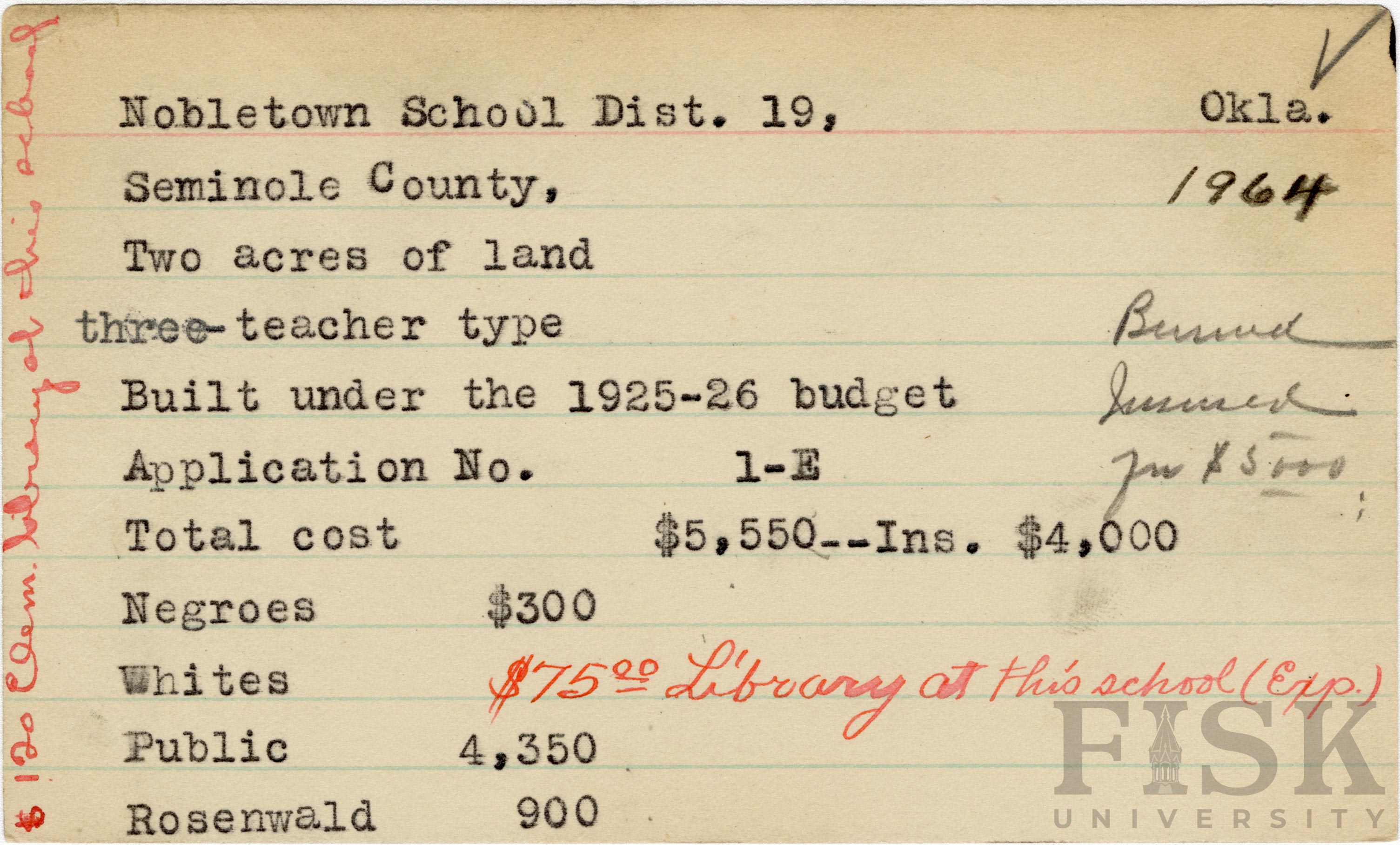 School card from Rosenwald Fund for Nobletown School Dist. 19 in Seminole County, Oklahoma with a section added to the budget contributions that says, "Ins. $4,000". Handwritten notes on the card say, "Burned, insured for $5,000," "$75.00 library at this school (Exp)," and "$120 elem library at this school"