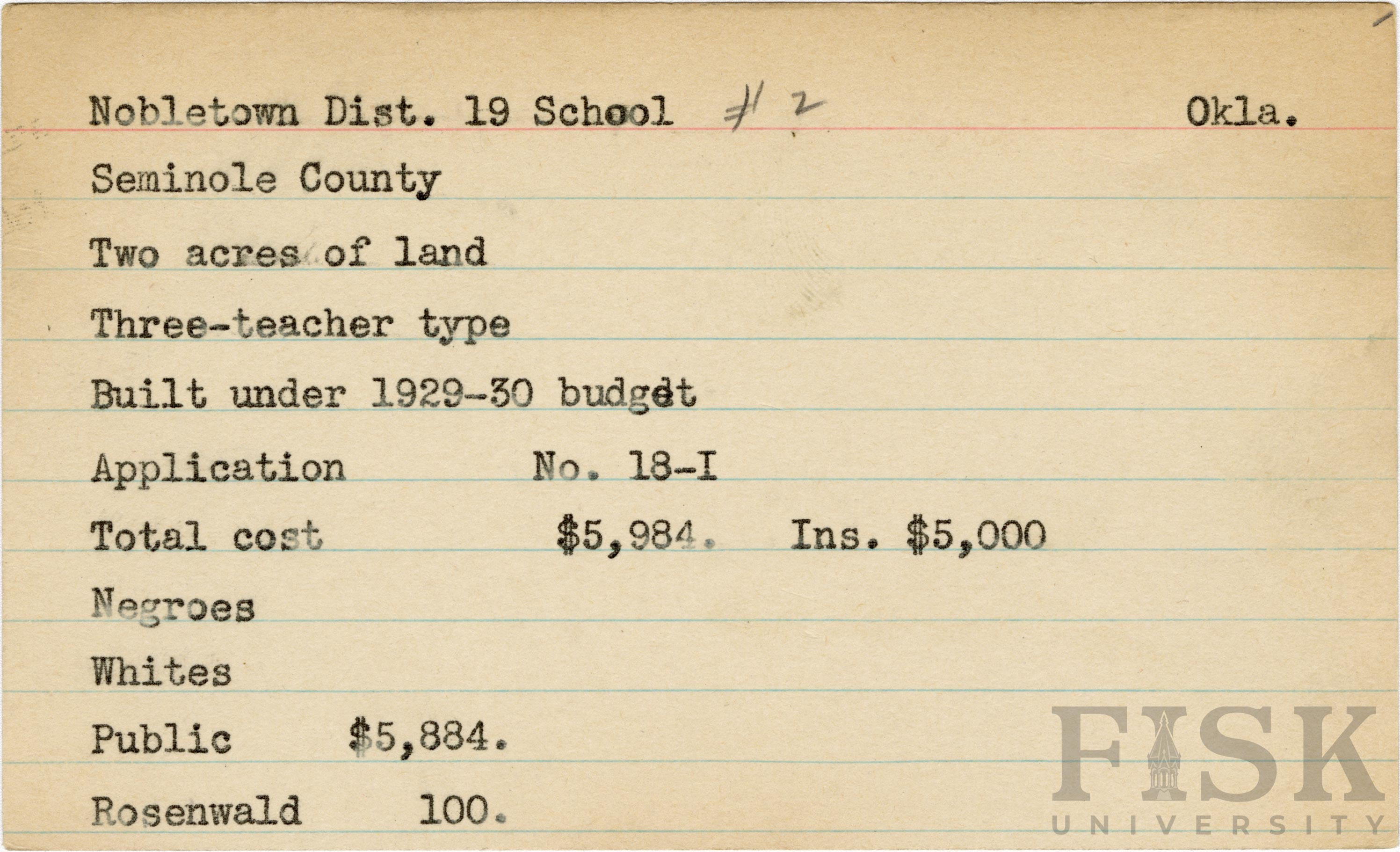 - School card from Rosenwald Fund for Nobletown Dist. 19 School No. 2 in Seminole County, Oklahoma with a section added to the budget contributions that says, "Ins. $5,000"