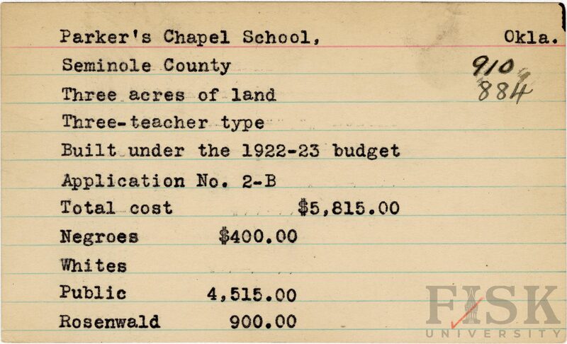 - School card from Rosenwald Fund for Parker's Chapel School in Seminole County, Oklahoma