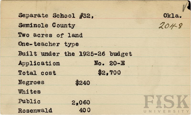 - School card from Rosenwald Fund for Separate School No. 32 in Seminole County, Oklahoma