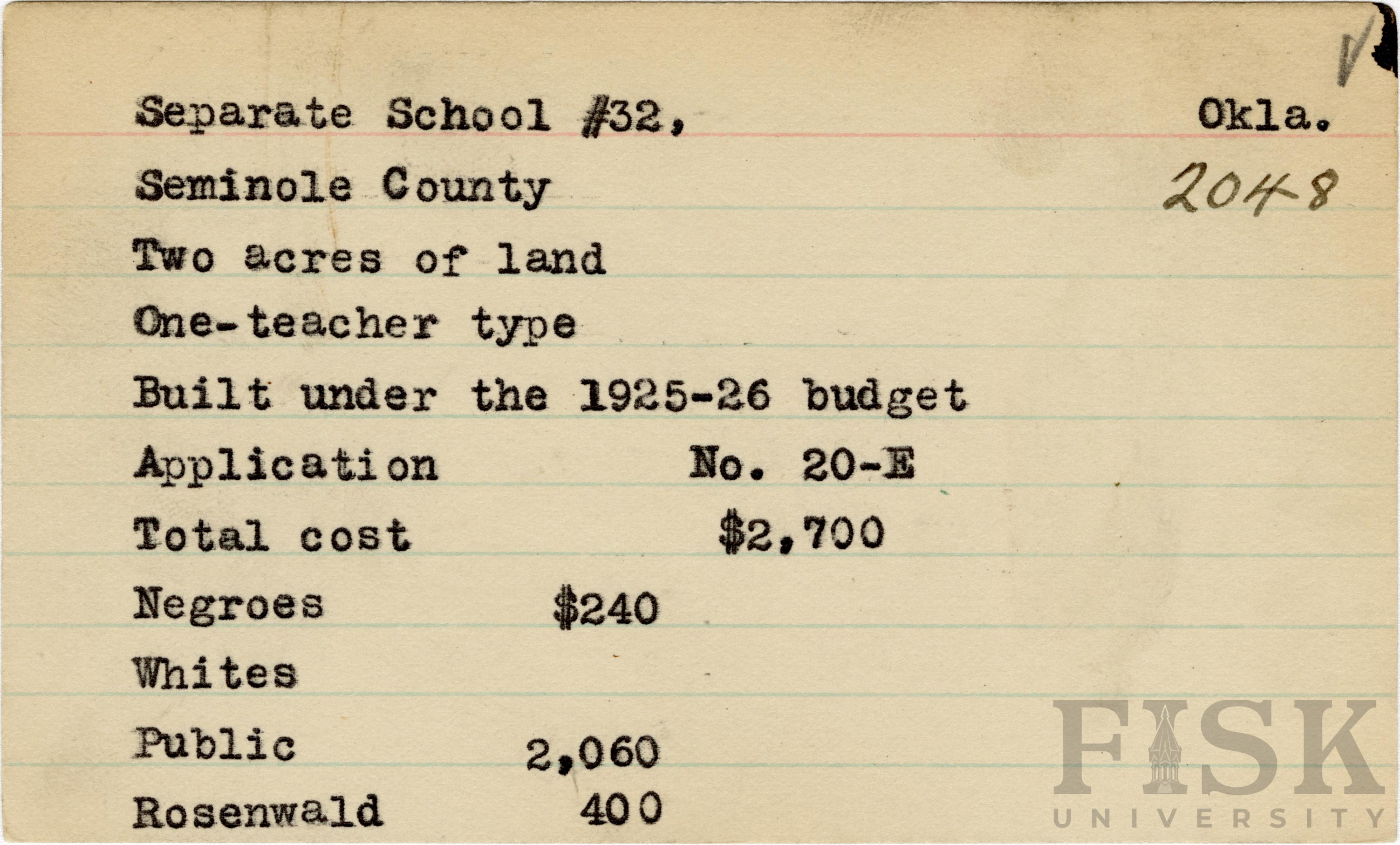 School card from Rosenwald Fund for Separate School No. 32 in Seminole County, Oklahoma