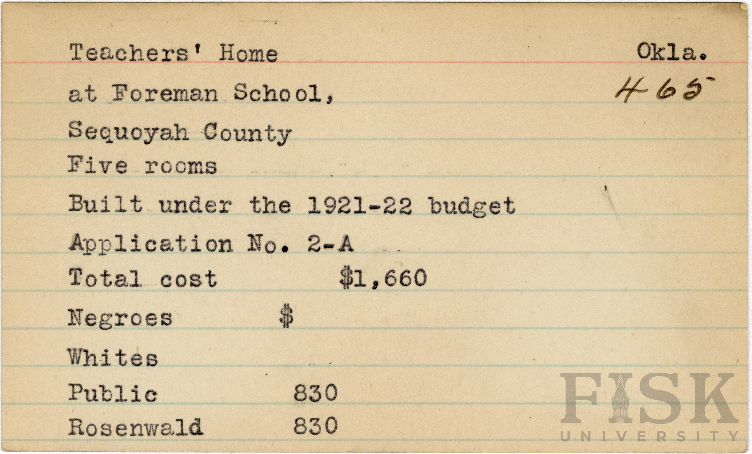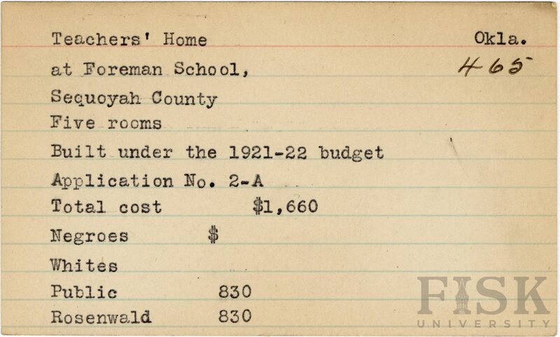 - School card from Rosenwald Fund for the five room shop at Foreman School in Sequoyah County, Oklahoma