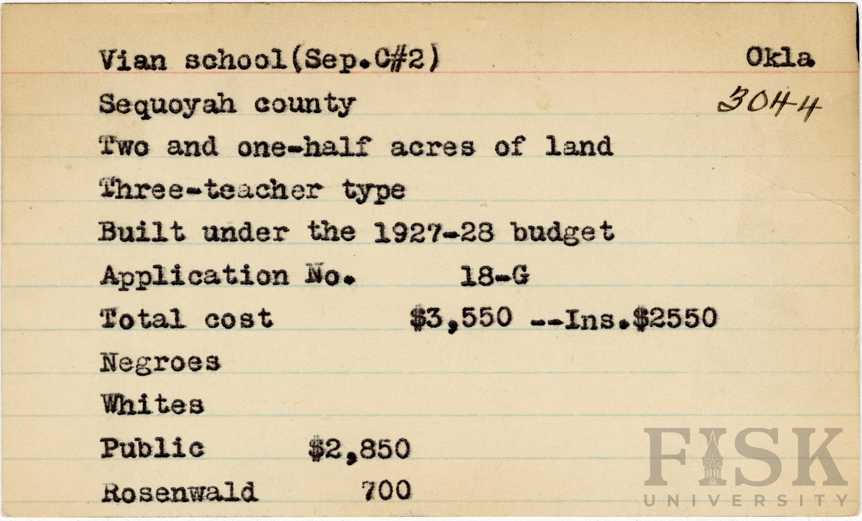- School card from Rosenwald Fund for Vian School in Sequoyah County, Oklahoma with a section added to the budget contributions that says, "Ins. $2,550"