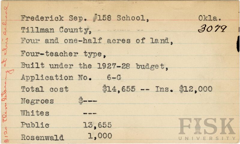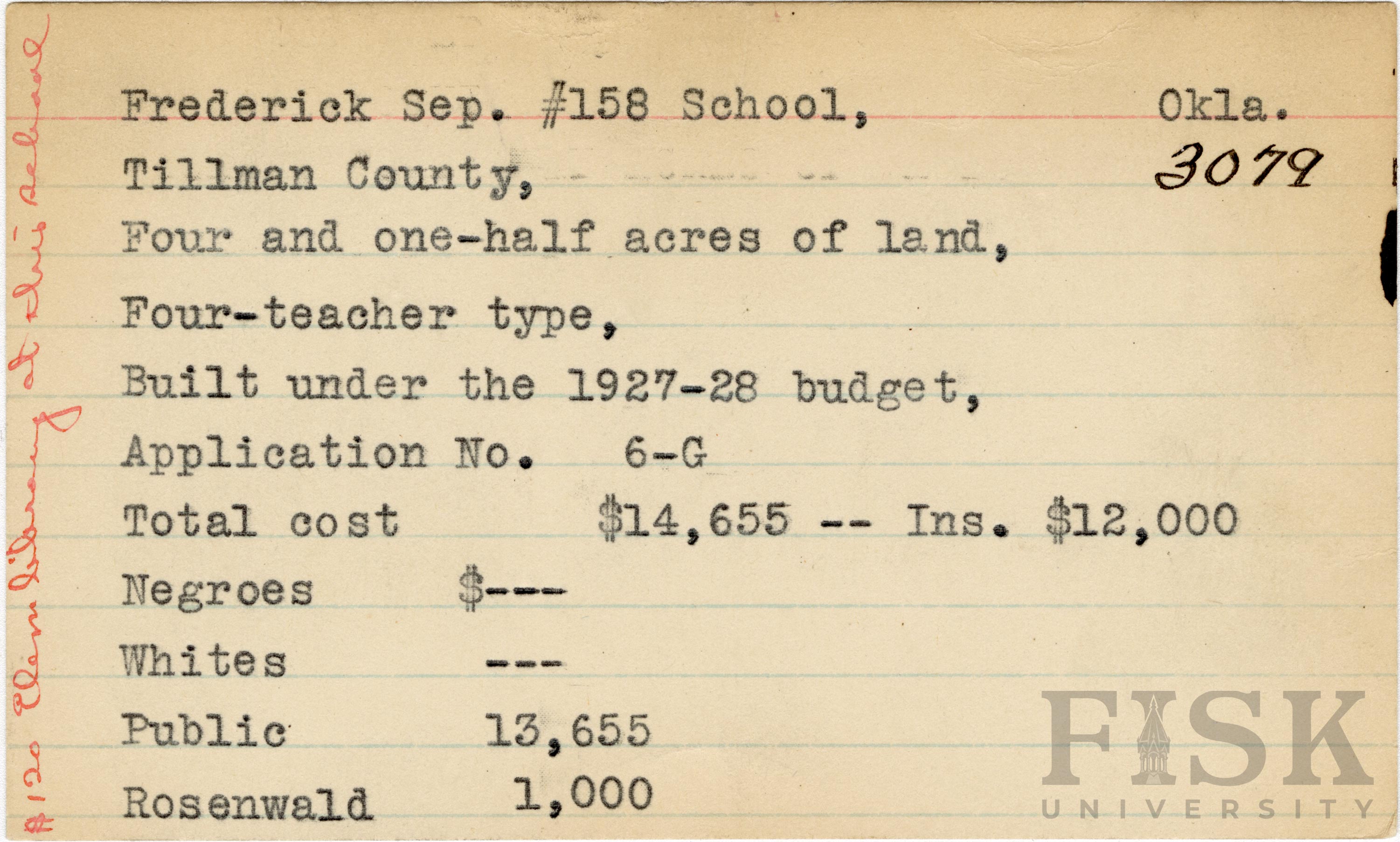 - School card from Rosenwald Fund for Frederick Sep. No. 158 School in Tillman County, Oklahoma with a section added to the budget contributions that says, "Ins. $12,000" and a handwritten note on the far left of the card that says, "$120 elem library at this school"