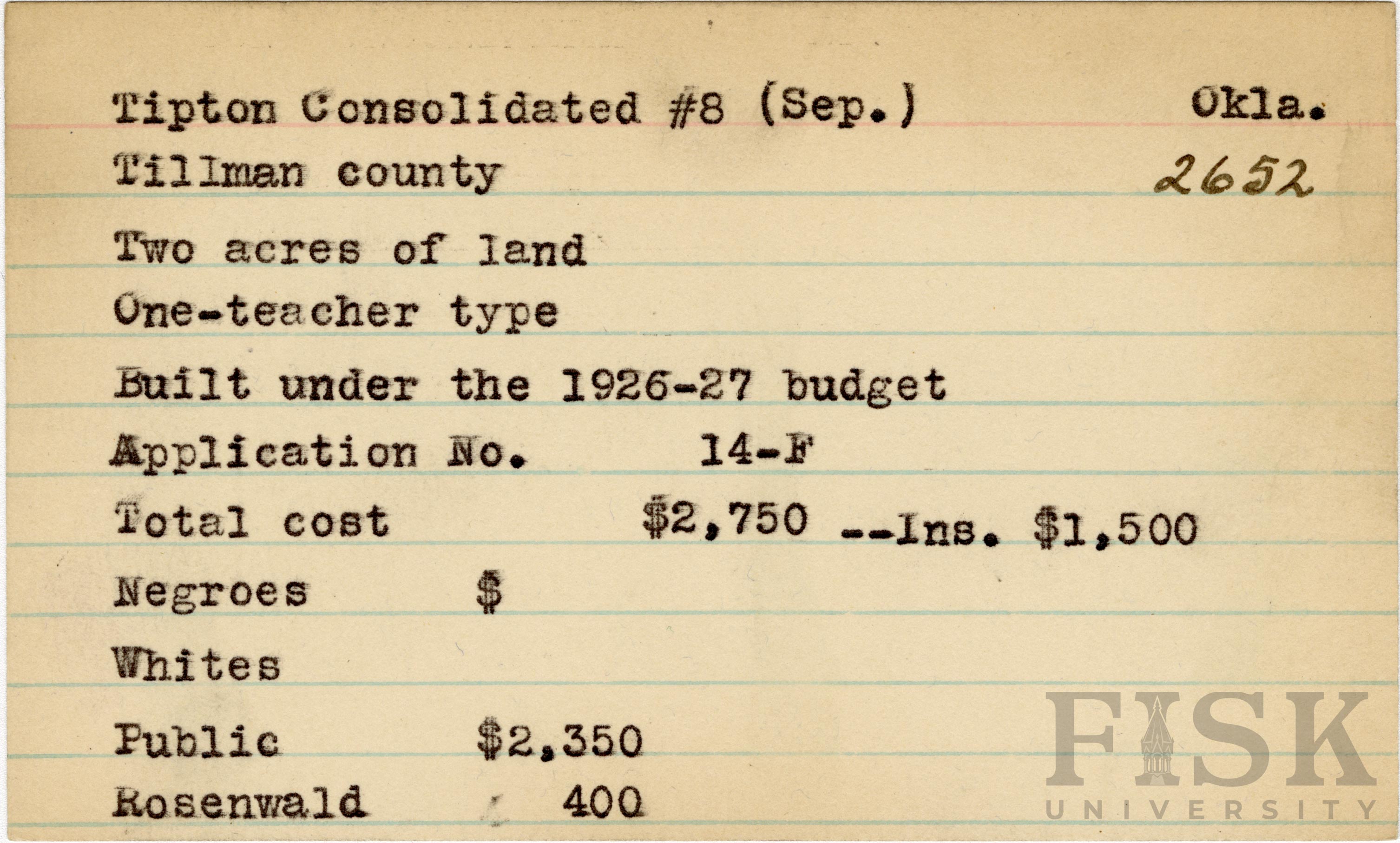 - School card from Rosenwald Fund for Tipton Consolidated No. 8 in Tillman County, Oklahoma with a section added to the budget contributions that says, "Ins. $1,500"