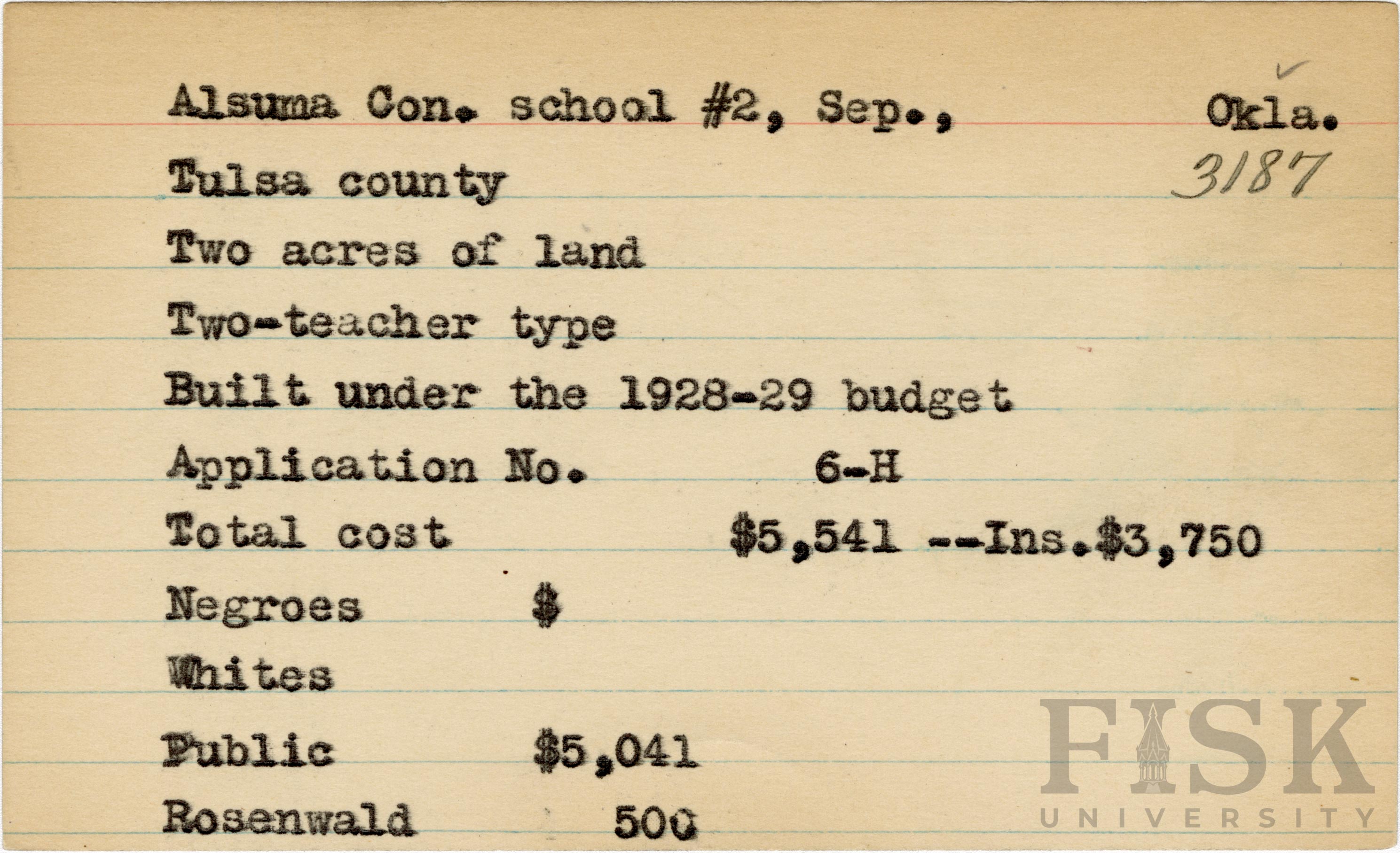 - School card from Rosenwald Fund for Alsuma Con. School No. 2 Sep. in Tulsa County, Oklahoma with a section added to the budget contributions that says, "Ins. $3,750"