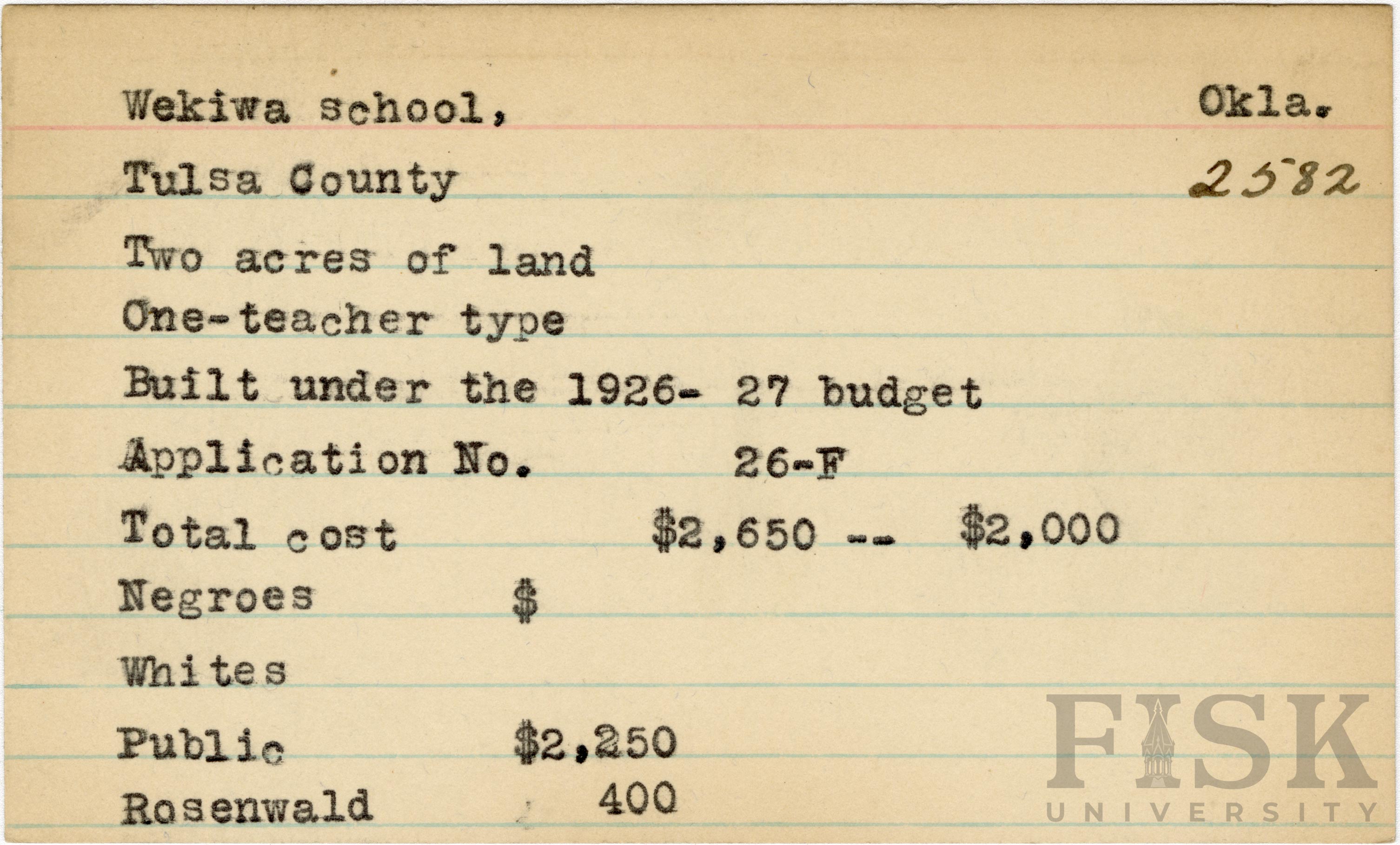 School card from Rosenwald Fund for Wekiwa School in Tulsa County, Oklahoma with a section added to the budget contributions that says, "Ins. $2,000"