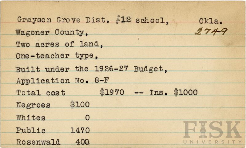 - School card from Rosenwald Fund for Grayson Grove Dist. No. 12 School in Wagoner County, Oklahoma with a section added to the budget contributions that says, "Ins. $1,000"
