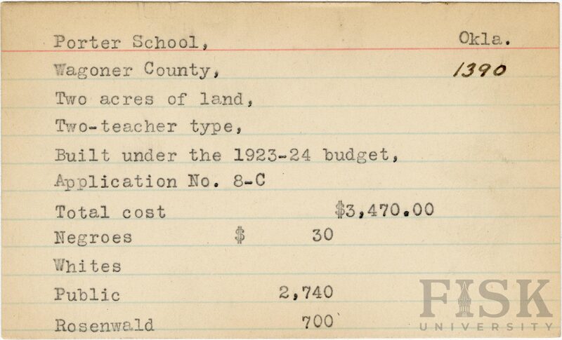 - School card from Rosenwald Fund for Porter School in Wagoner County, Oklahoma