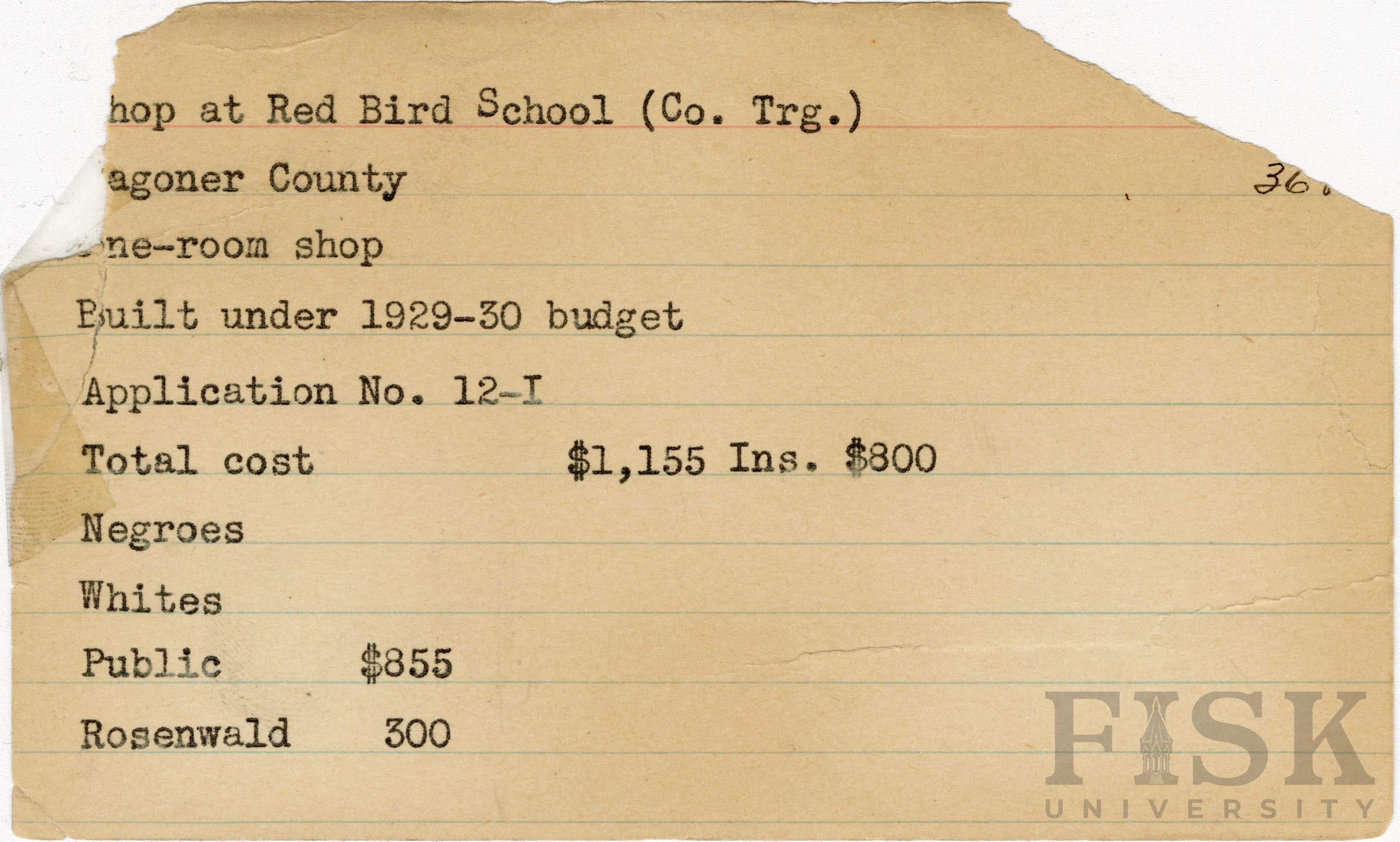 - School card from Rosenwald Fund for the one room shop at Red Bird District No. 35 School in Wagoner County, Oklahoma with a section added to the budget contributions that says, "Ins. $800"